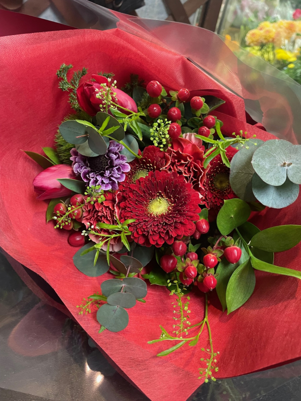 チューリップなどで春らしく、赤をメインにお作りした花束です。